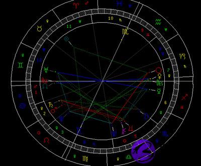 先看这张本命盘,我们就会立刻把注意力集中到位于一宫双子座与上升相合的天王星,它与冥王星呈六合相,与天底的海王星相拱,与掌管注意力的水星相冲。天水冲的相位暗示感觉神经及心智的紊乱。水星六合天底、拱冥王星对冲上升点和海王星,将这些相位和摩羯太阳与天秤海王星的刑相一起考虑,我们就不难理解为何这个病人会住进精神病院了。他认为自己在无形中接受了一次头部和喉咙手术,这次手术干扰了他的体质和思想。他患了精神分裂症住进了精神病院。